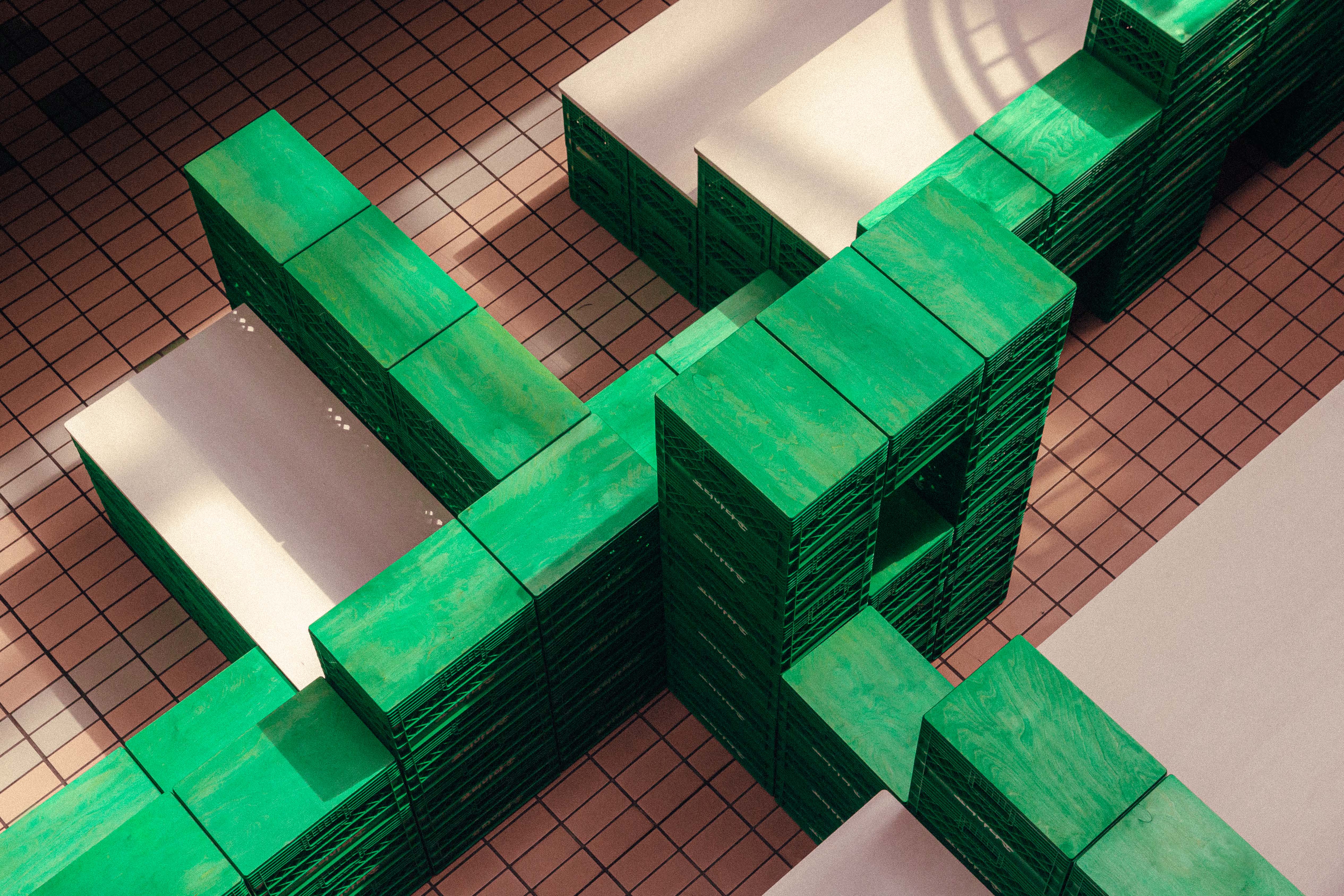 Located within Koreatown Plaza, Koreatown's largest shopping center, a design-build installation uses approx. 400 customized milk crates to create a flexible, cost-effective, and engaging alternative to traditional shopping mall kiosks. Services include design-build and project management. Millwork provided by Object Space LA.