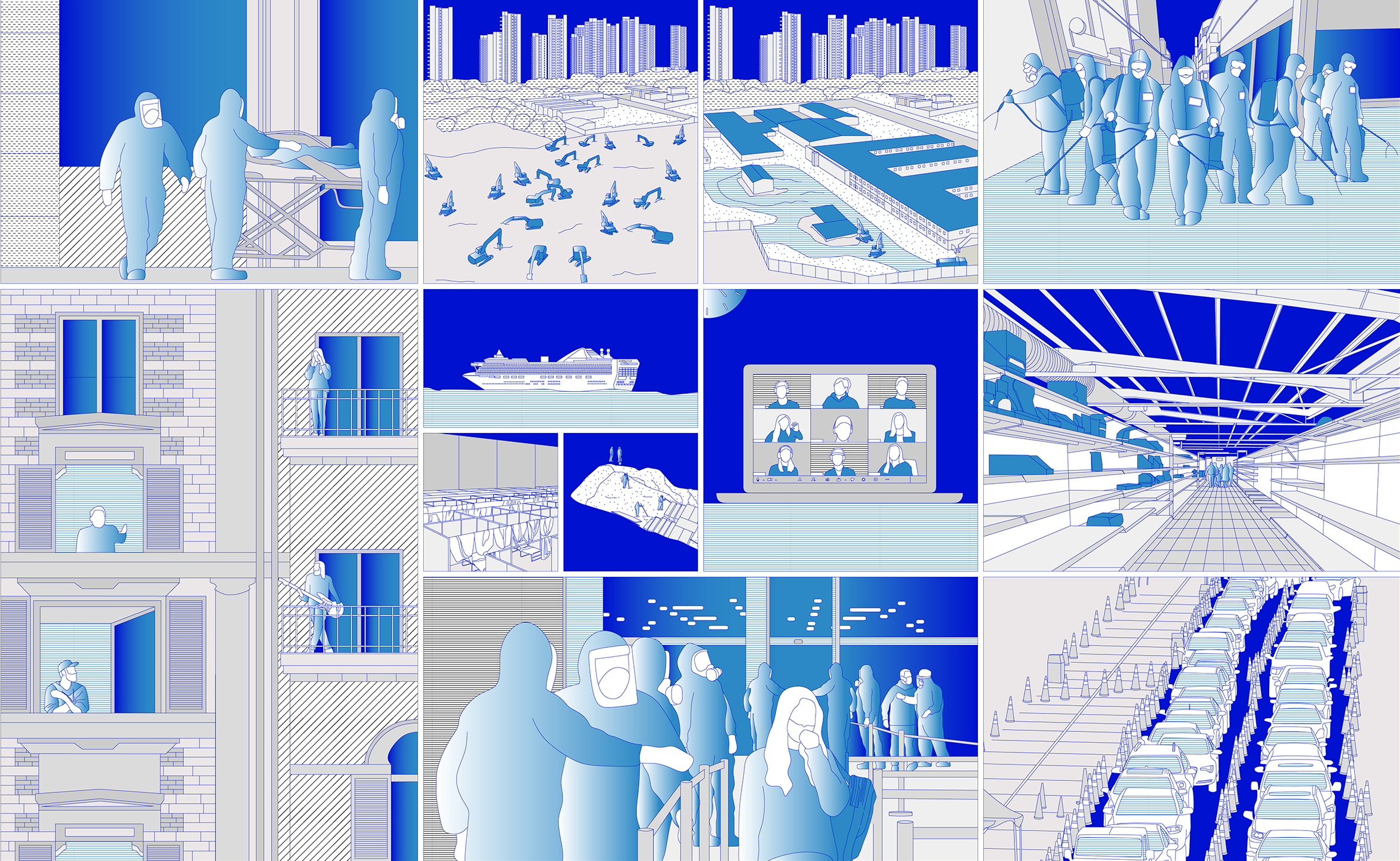 InDialogue is a visual synopsis of quantitative and qualitative concerns written and represented during the coronavirus pandemic. Its series of data visualizations and illustrations translate the often overwhelming medical statistics into comparisons and visualizations legible to a larger public, documenting the events, statistics, and protocols that surfaced change consistently during the pandemic. The research was supported by the 2020 Summer Research Fund from Harvard School of Design. Data and statistics research provided by epidemiologist Joyce Pak and computer science engineer Joshua Sungin Park.