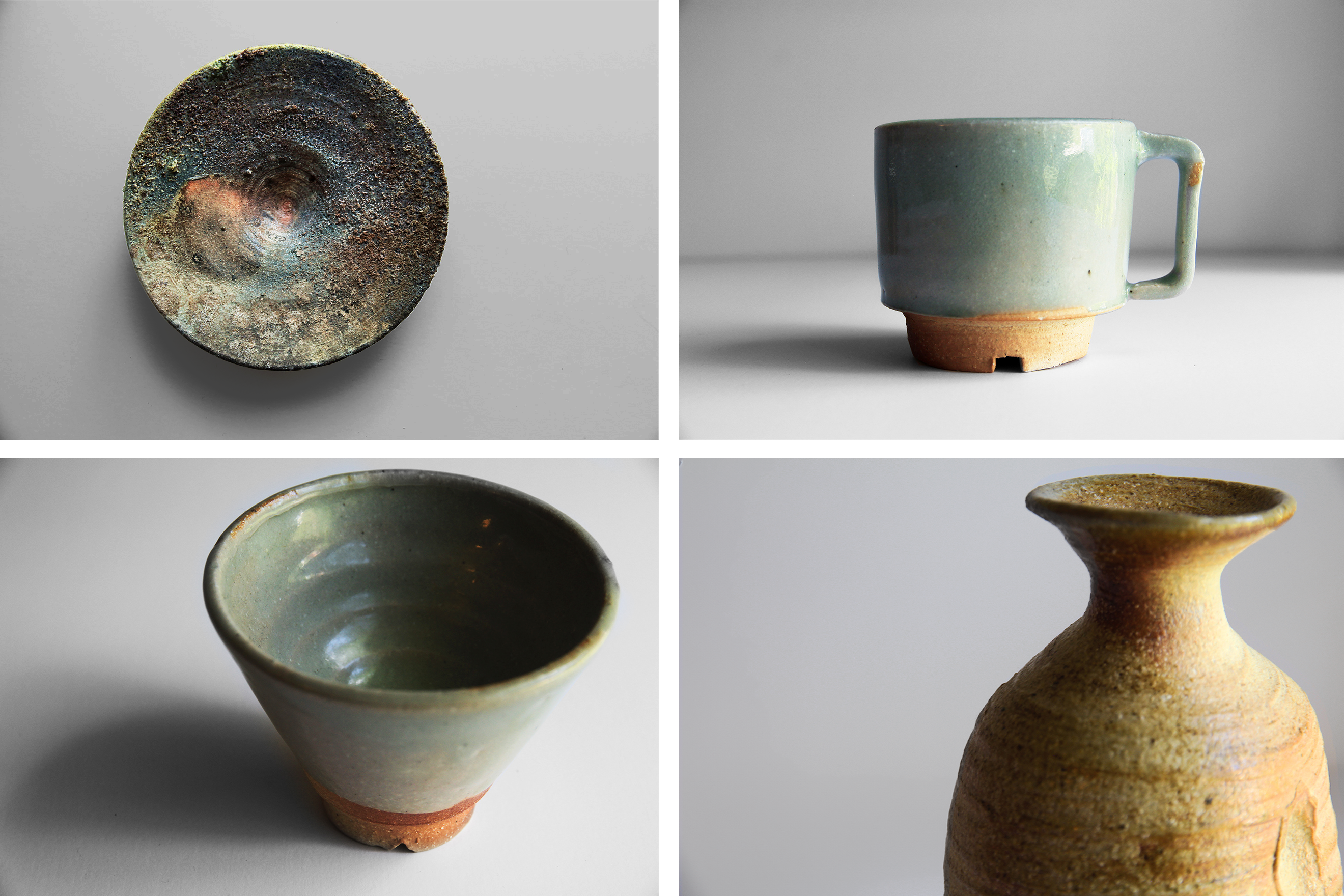 ceramic plate, mug (small), tea cup (medium), and vase.